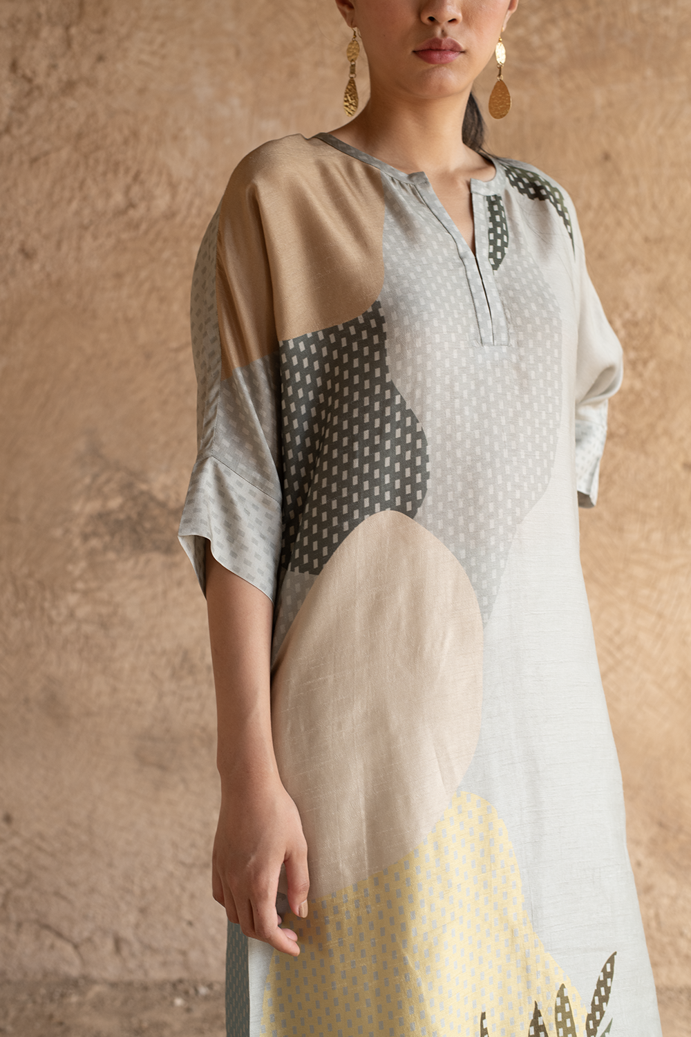 A two piece straight kurta set with high low pattern made in rich dupion silk fabric designed in-house.