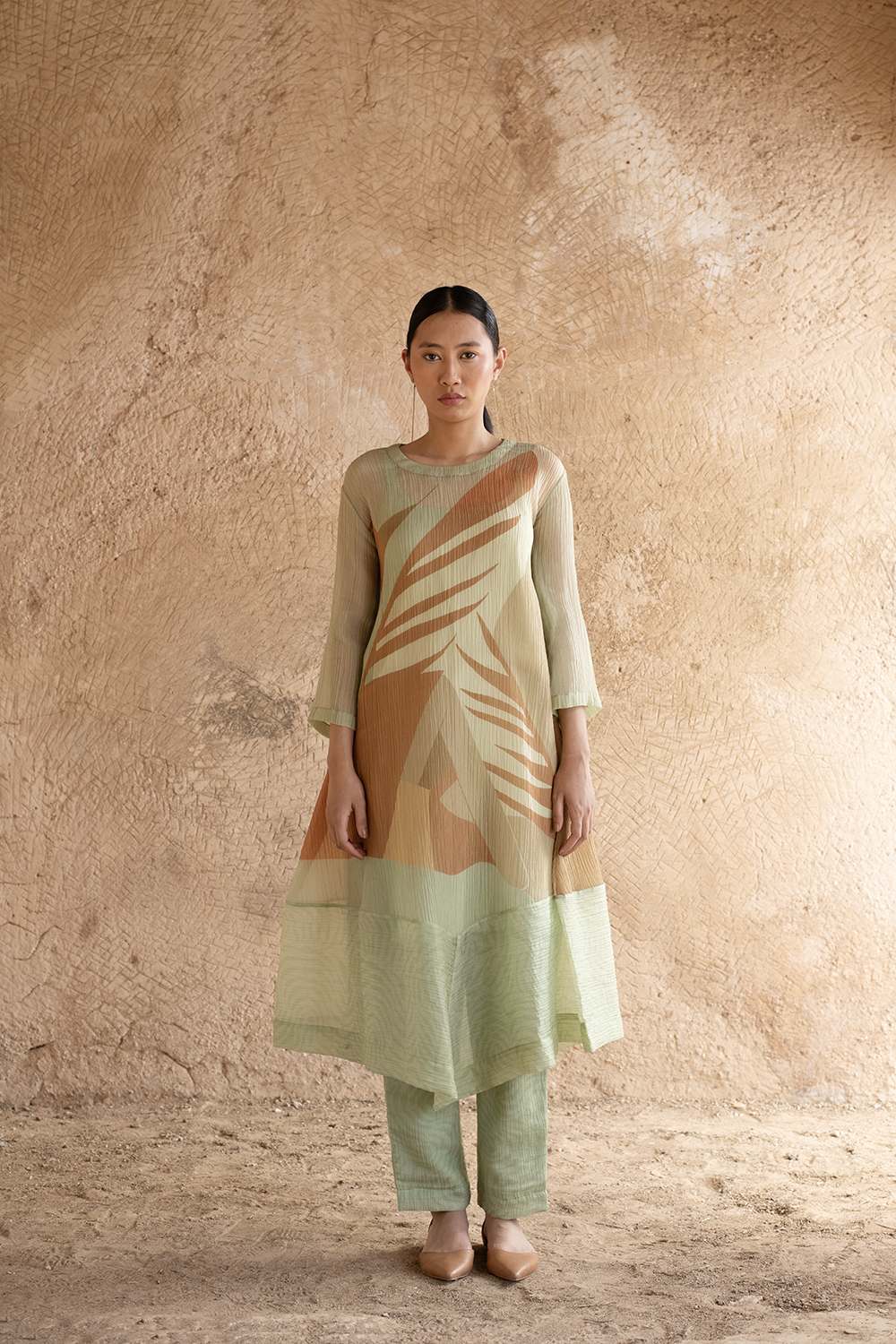 A three piece A-line tunic kurta set with round neck and long sleeves expressing abstract prints designed in-house. Includes an inner made in calico cotton.