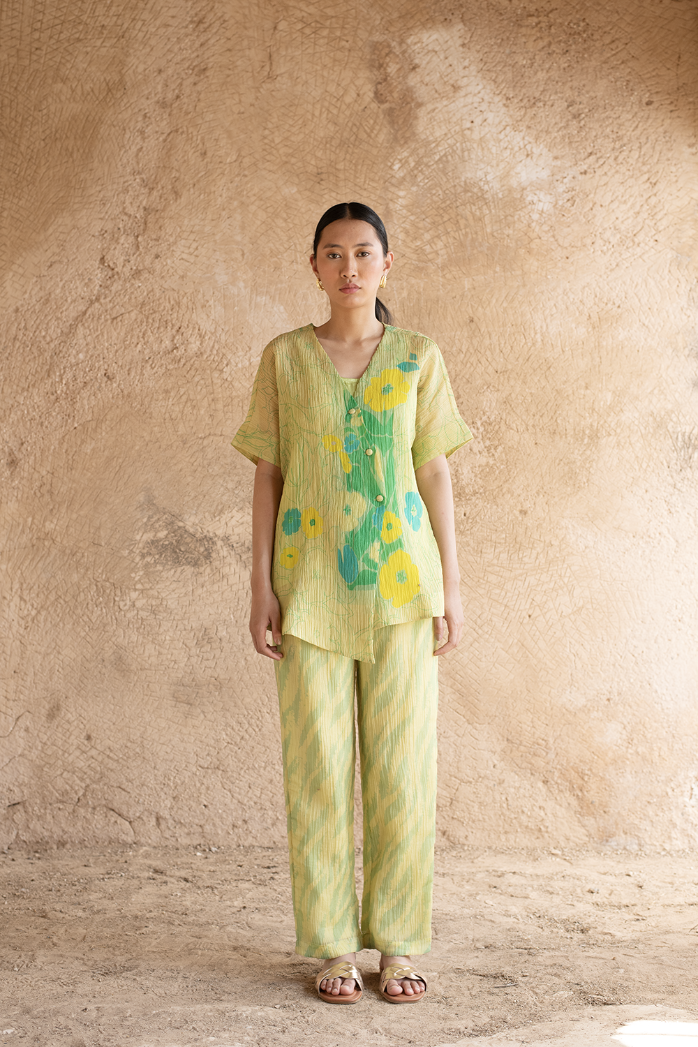 A three piece co-ord set with overlapping jacket style shirt made in rich plant based Japanese fabric designed in-house. Includes an inner made in calico cotton.