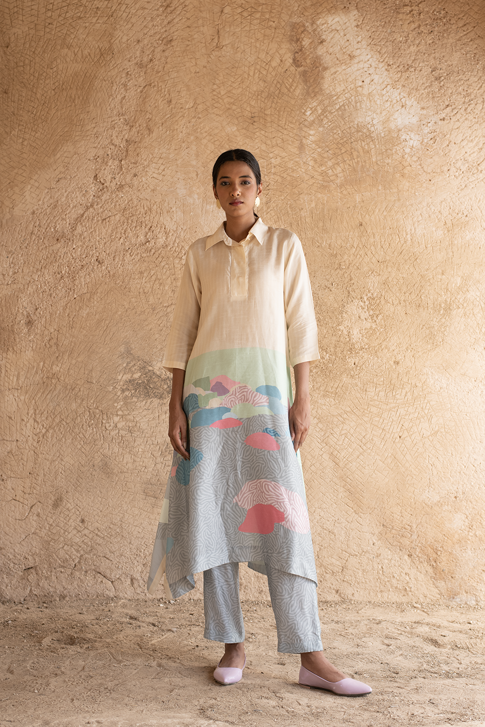 A two piece rich dupion silk set comprised of a standard collared kurta with A -line details