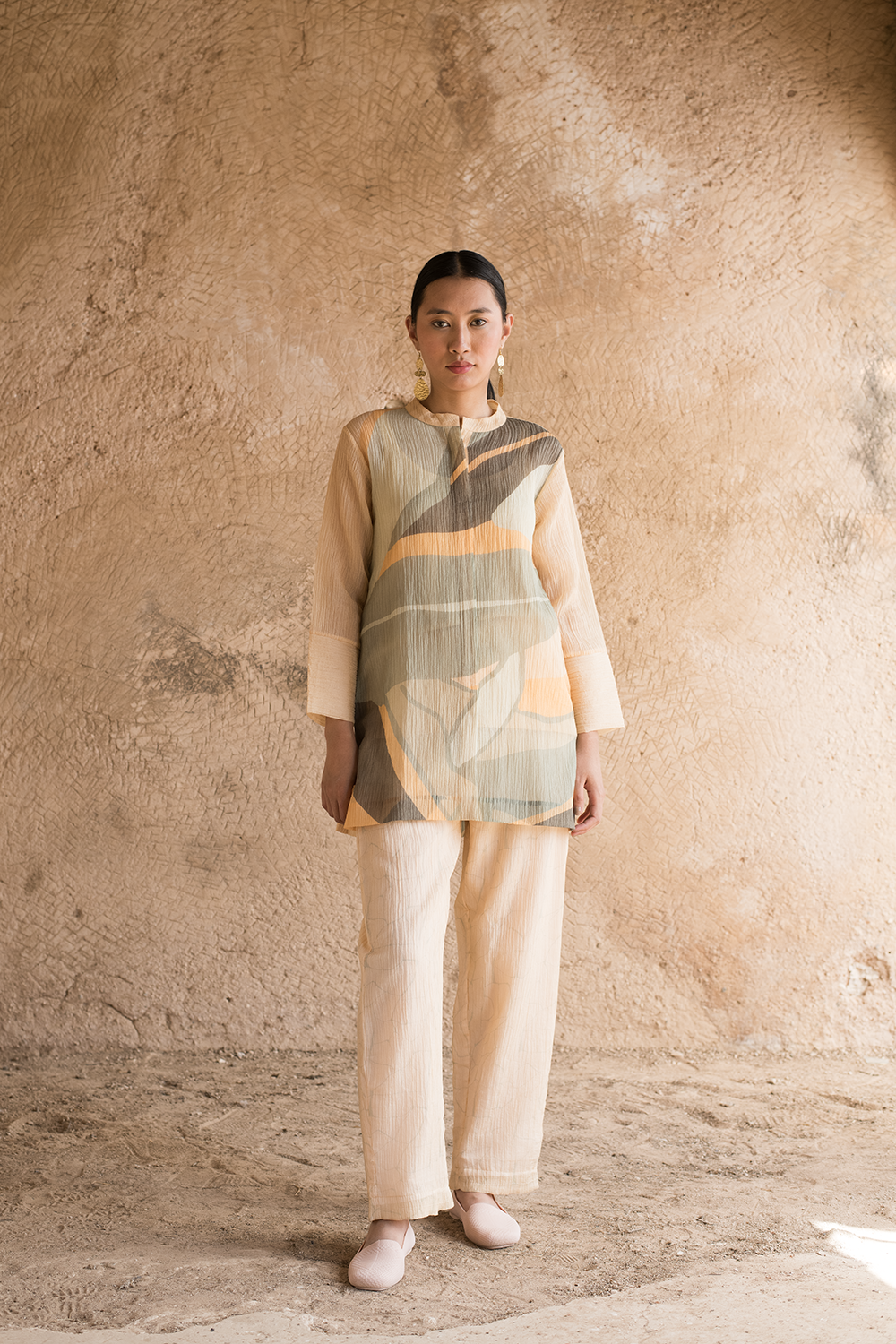 A three piece co-ord set comprises of a collared shirt pattern with long cuff sleeves expressing abstract prints designed in-house.