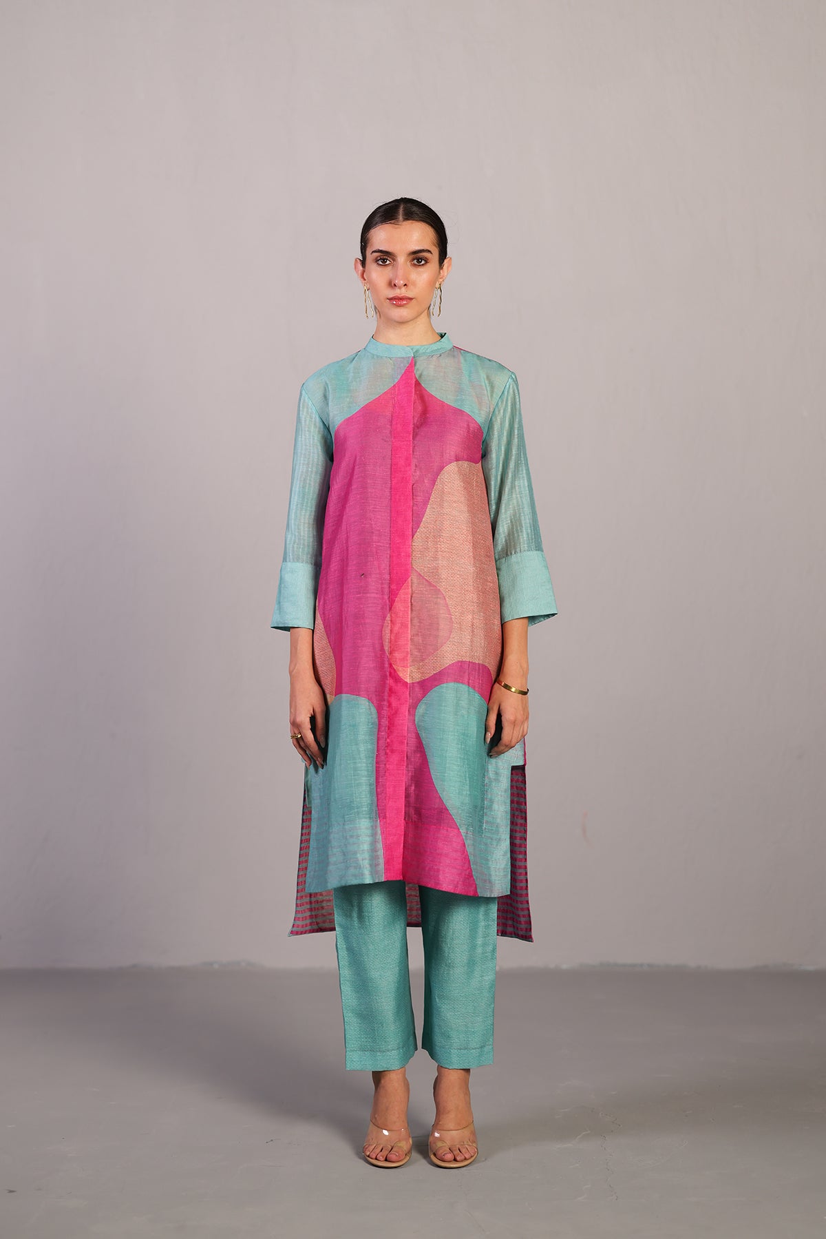 A pink & blue kurta set with long sleeves & a round collar along with straight pants curated in a subtle sheen linen fabric with water colour brush strokes, designed in-house. Fabric - Linen Silk Color - Doll Pink & Aqua Blue No. of Components - 2 Care - Dry...