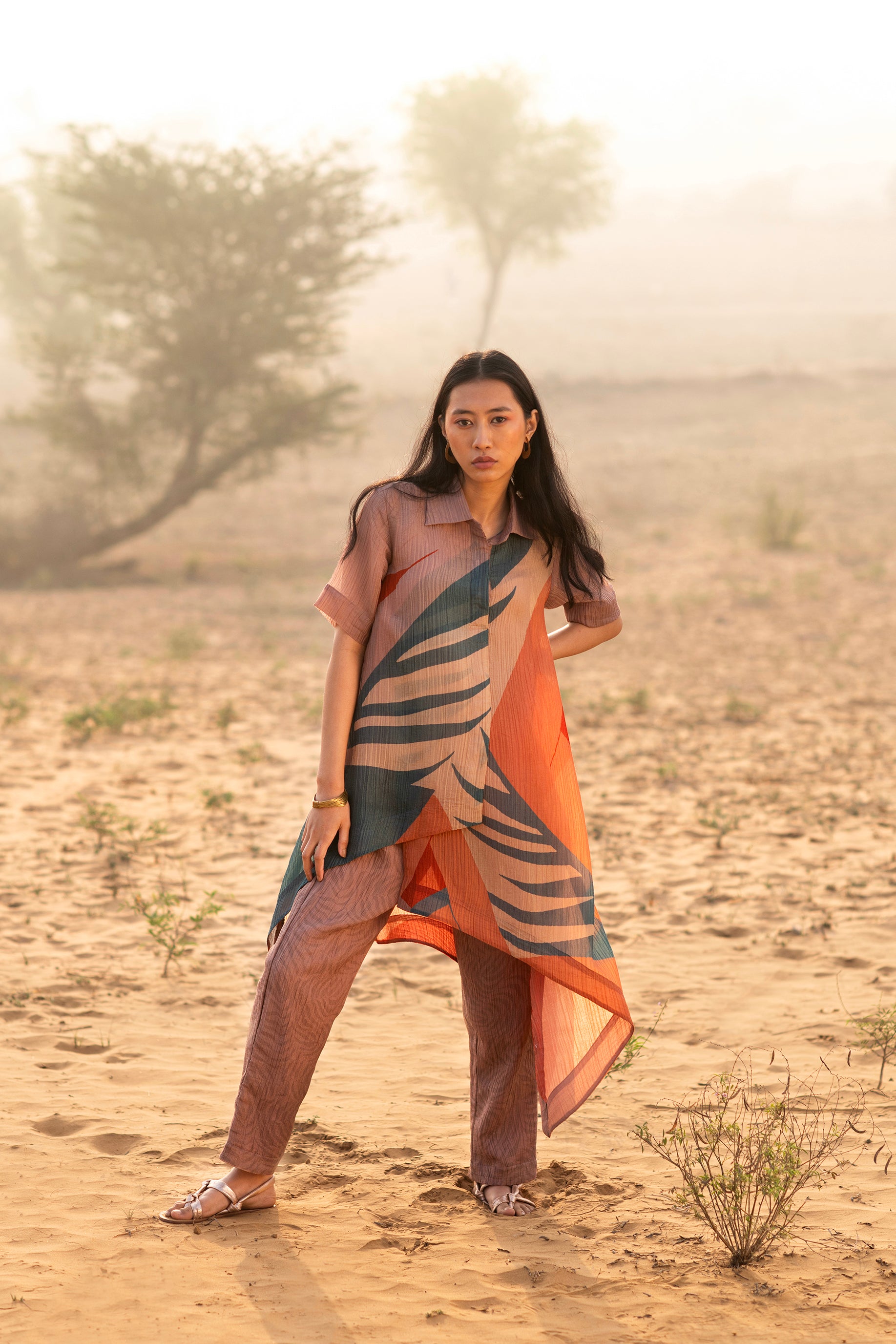 A two piece set in unique asymmetrical pattern made in rich plant based Japanese fabric, inclusive of the inner and the pants.