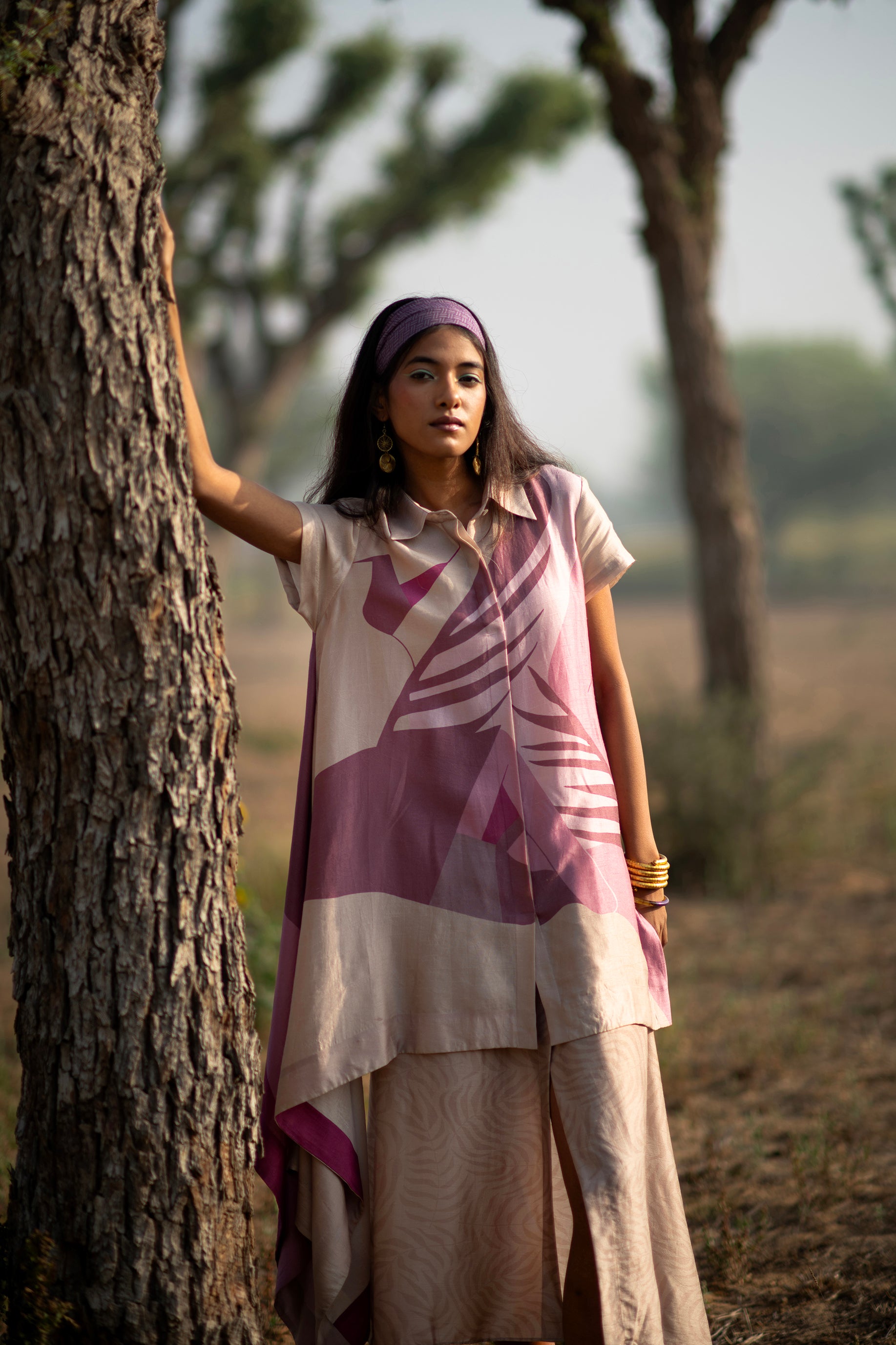 A two piece co-ord set with asymmetric top  made in rich Japanese plany based fabric, paired with a straight centre slit skirt
