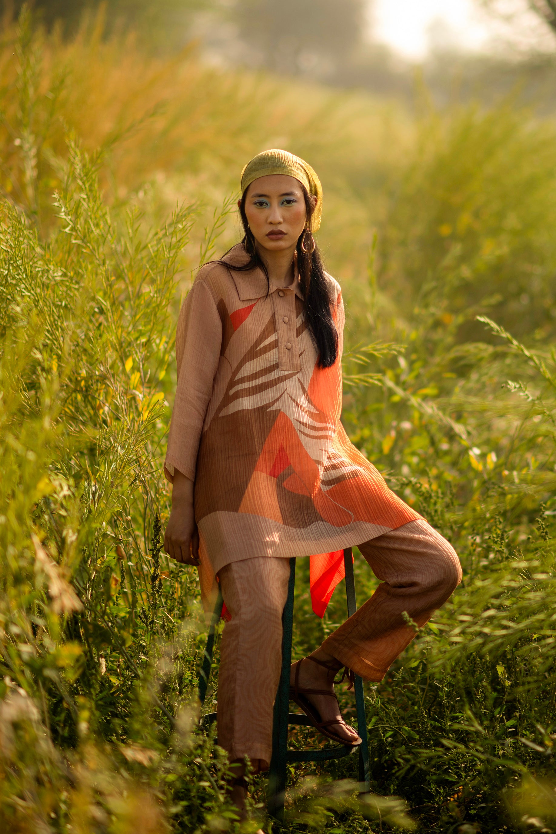 A three-piece co-ord set with high-low pattern, collar and long sleeves expressing abstract prints designed in-house, inclusive of pants and the inner.