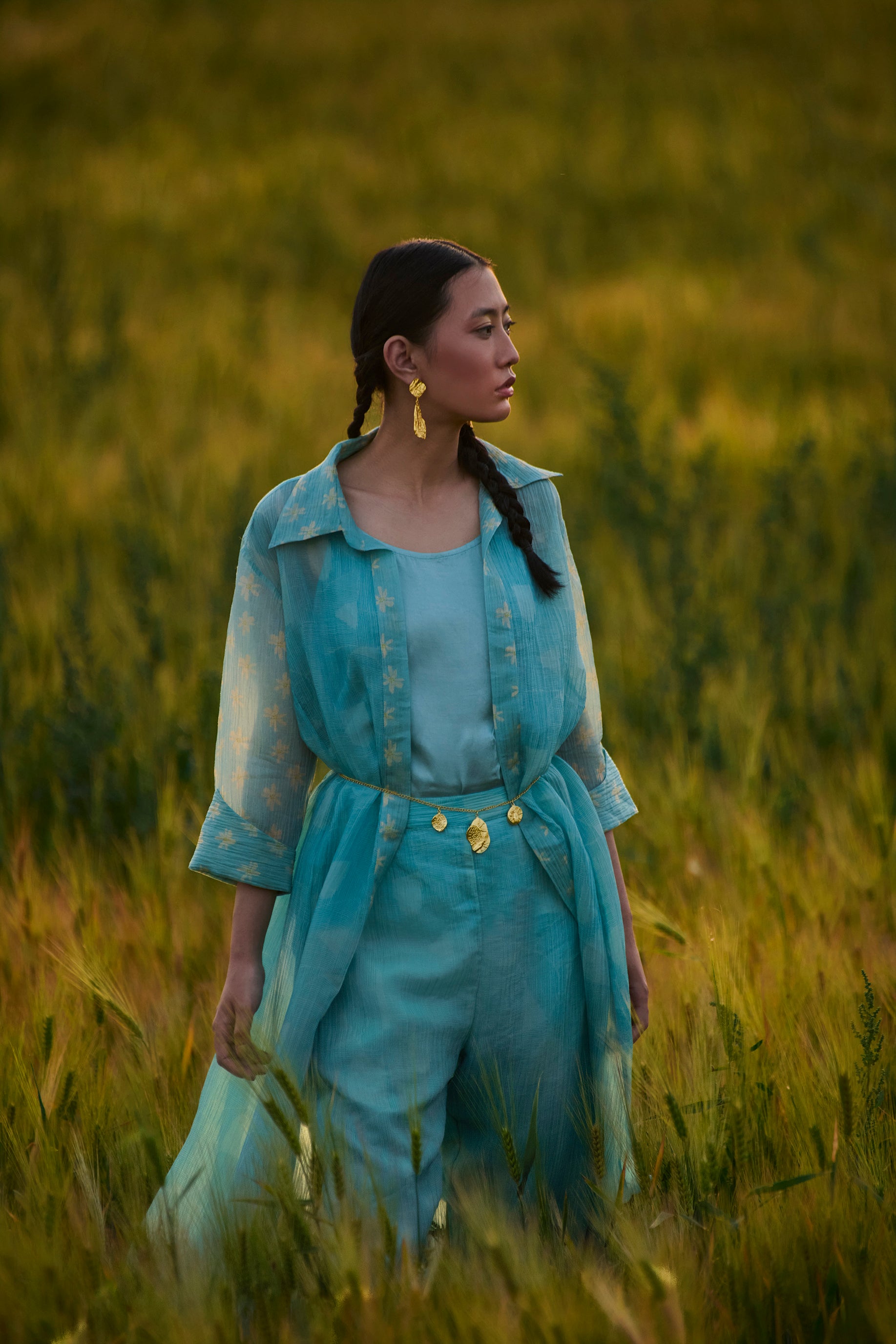 A three piece jacket set comprises of a collared shirt pattern paired with pants expressed in abstract prints designed in-house plant based Japanese fabric