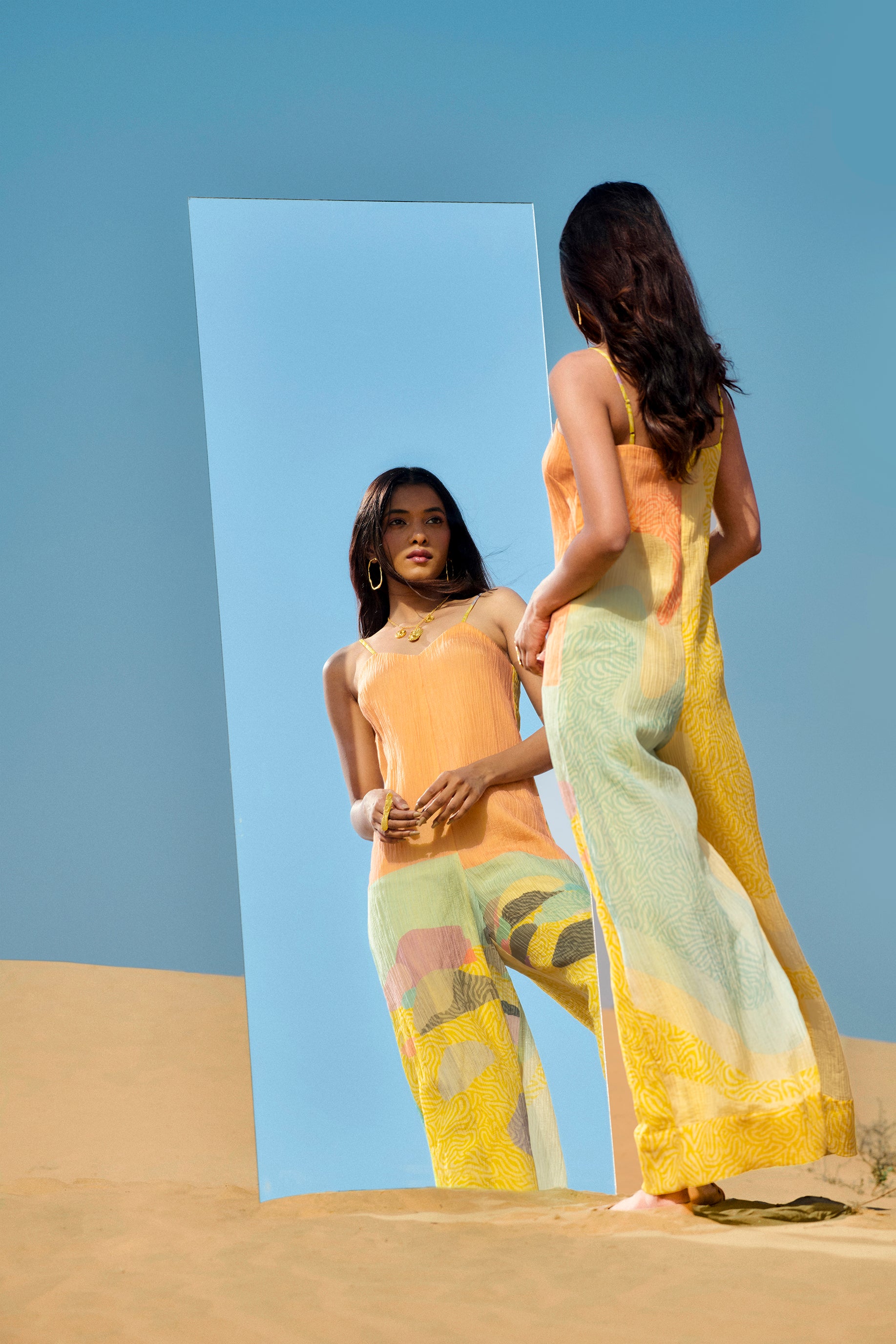 A jumpsuit with thin straps expressing abstract prints designed in-house.
