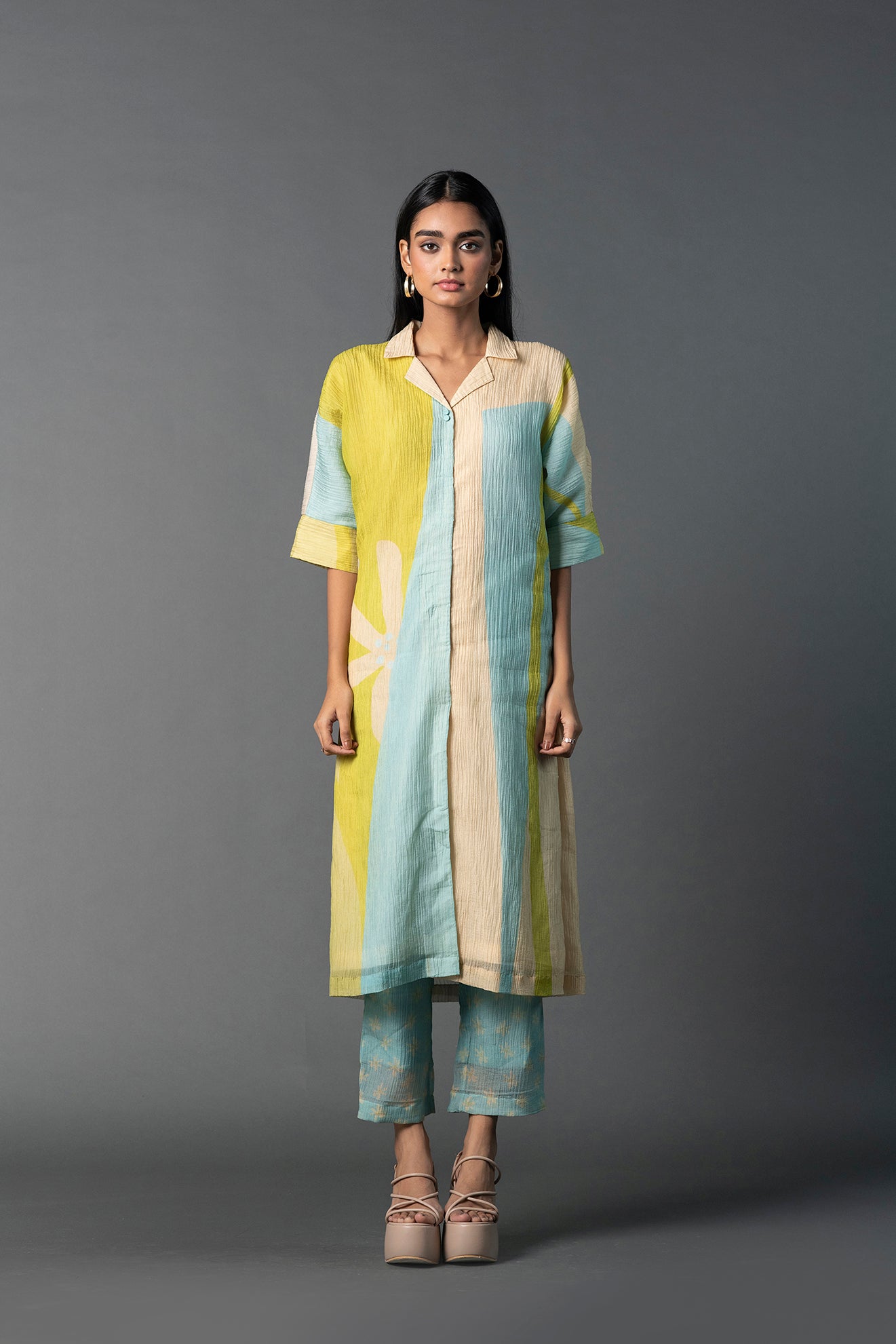 Straight shirt with decent lapel collar and elbow comfort sleeves paired with contrast print pants.