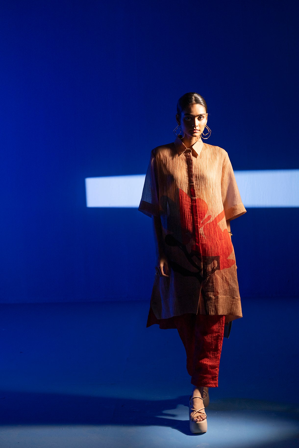 A two piece tunic set comprises of straight cut kurta with collar and bell sleeves expressing abstract prints designed in-house.