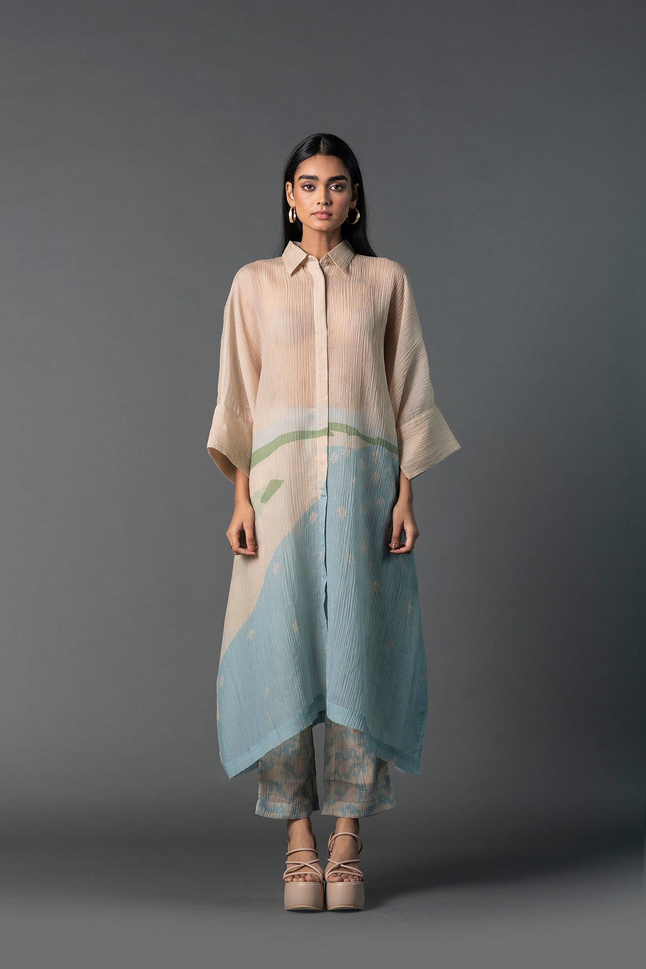 A-line raglan sleeves with contrast print pants gives a soothing silhouette with utmost sophisticated look.