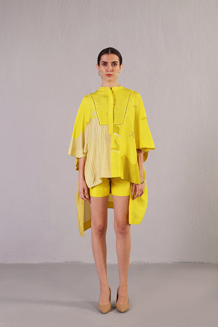 A bright yellow Co-ord set comprising of a free-size kaftan with side ties & shorts with front pockets curated in a soft silk fabric, designed in-house. Fabric - Dupion Silk Color - Lemon  Yellow No. of Components - 2 Care - Dry Clean  Delivery - 21 Days