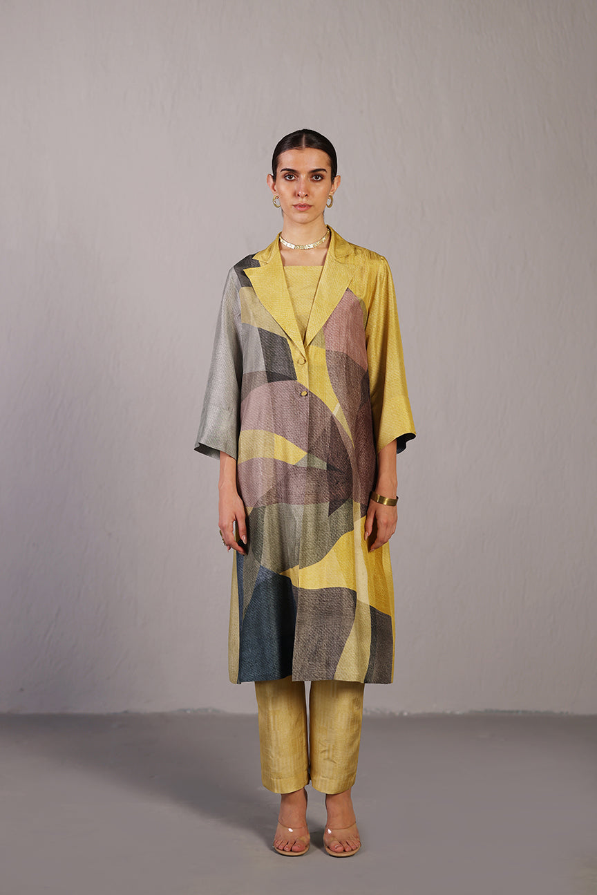 A yellow-grey kurta set comprising of a long bright coloured jacket with long sleeves, a cut sleeve inner & straight pants curated in a soft silk fabric, designed in-house. Fabric - Dupion Silk Color - Yellow & Grey No. of Components - 3 Care - Dry Clean  Delivery - 21...