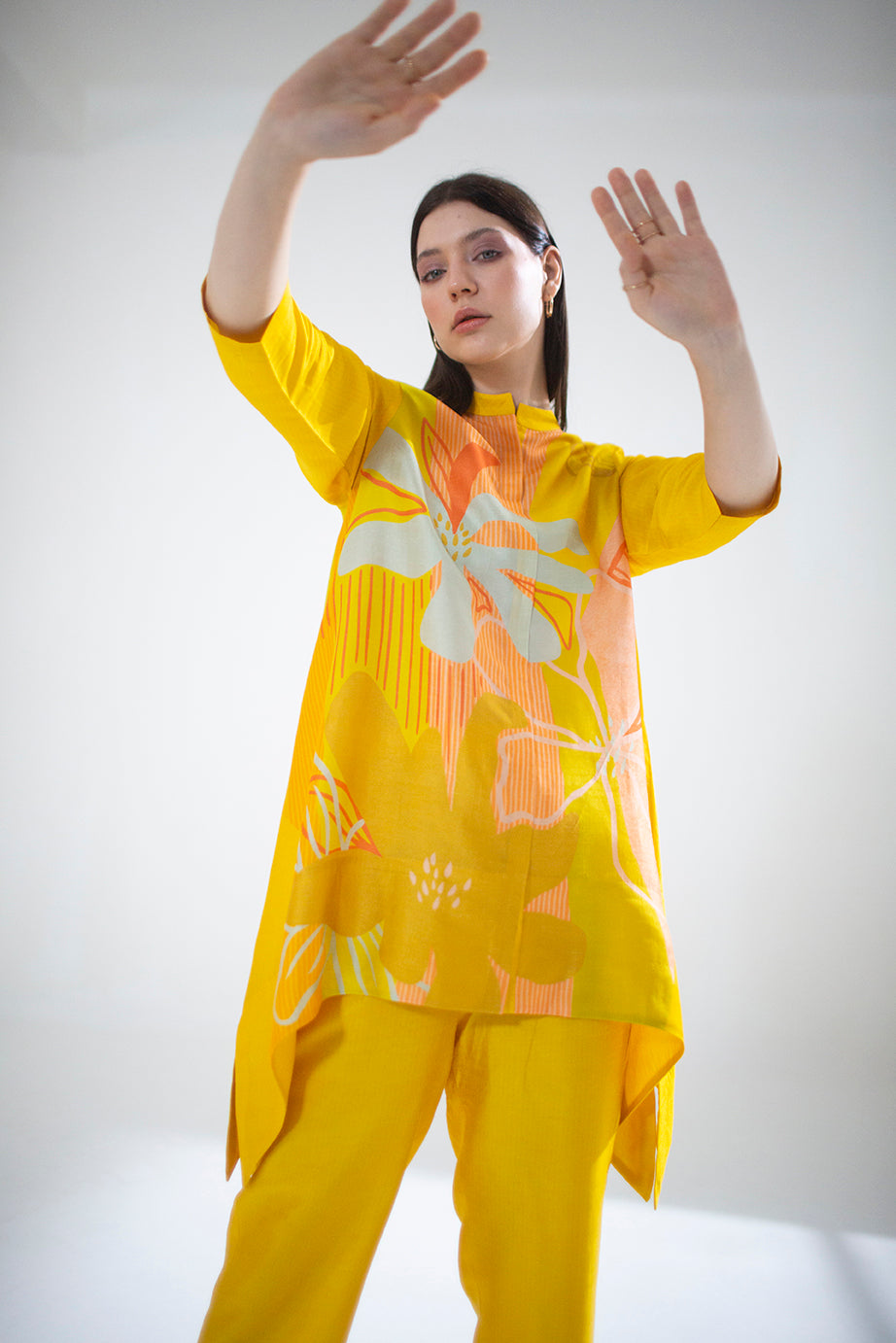 A two piece dupion silk set comprised of abstract geometric and floral print in playful color compositions and parallel pants with fusion textiles.